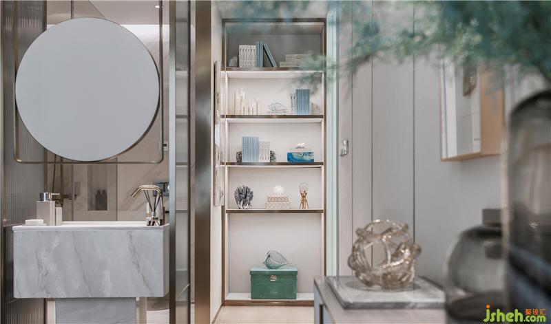 獨立的洗手臺面和懸吊的藝術掛鏡,無一不彰顯獨家定制的私享品質感。藝術空間給予了人們對生活的美好向往。未來家庭生活的憧憬讓整個主臥空間浸潤在藍寶石般的幸福感之中。