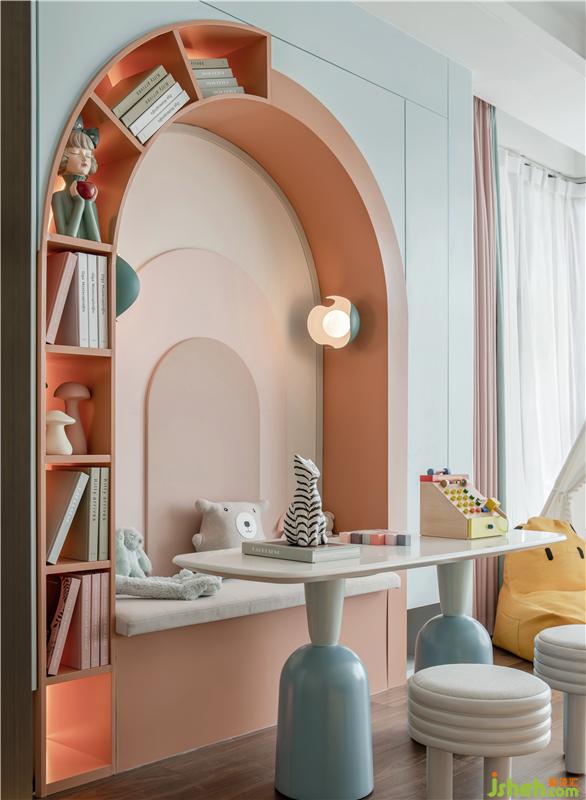 無論是床頭柜,還是墻面裝置,無不流露出對積木拼接的活化運用,構筑起這個歡樂的童話王國,讓其搭載孩童稚嫩而精彩的夢。為未來描繪無限暢想。