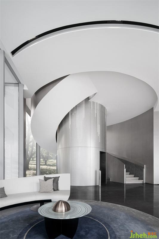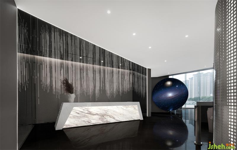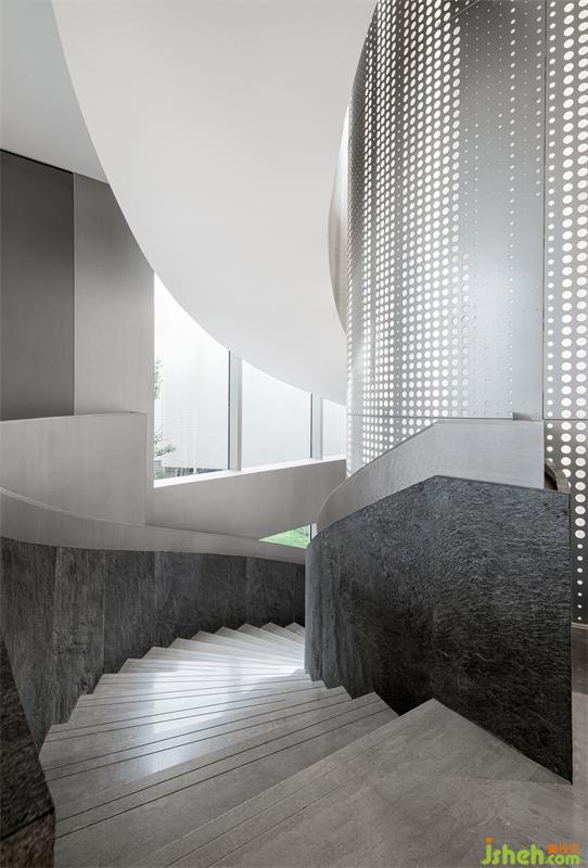 瀑布圖案+沖孔鋁板可視化呈現(xiàn),像星河傾瀉,從前廳旋轉(zhuǎn)樓梯的表面更新形成信息流,盤旋向上傳遞到二層前廳,充滿流動(dòng)的前衛(wèi)科技感。