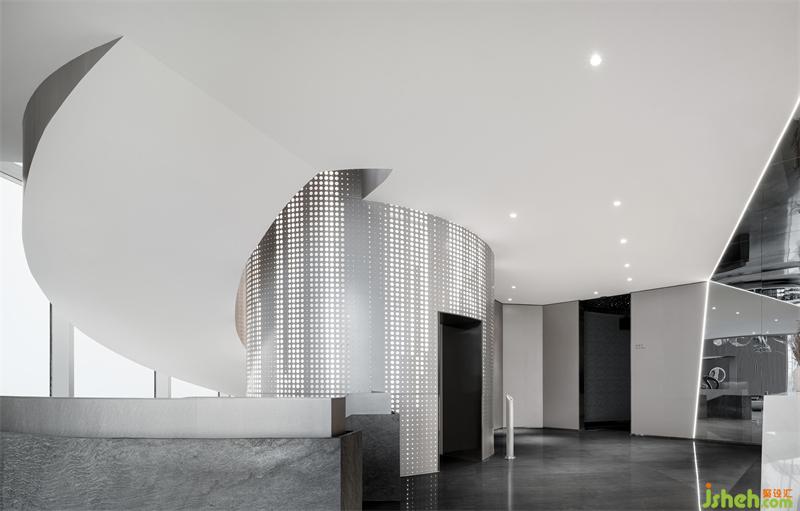 太空旅客上樓邁出信息艙,到達(dá)飛船二層。鏡面不銹鋼材質(zhì)的回字形墻面前,“銀河”傾瀉而下。鏡中河利用德羅斯特效應(yīng)延伸開(kāi)來(lái),大大擴(kuò)展了二層前臺(tái)空間。雙色透光石臺(tái)面上的LED燈搭配沖孔鋁板,營(yíng)造出萬(wàn)千星河璀璨無(wú)垠的景象。