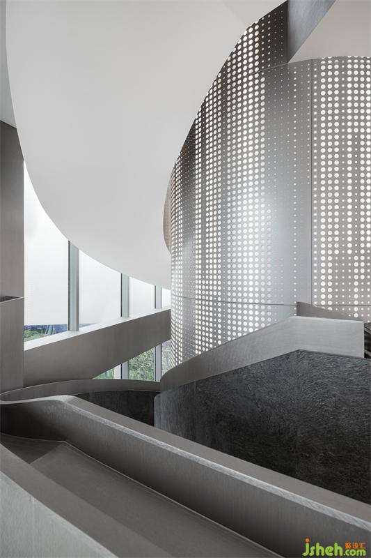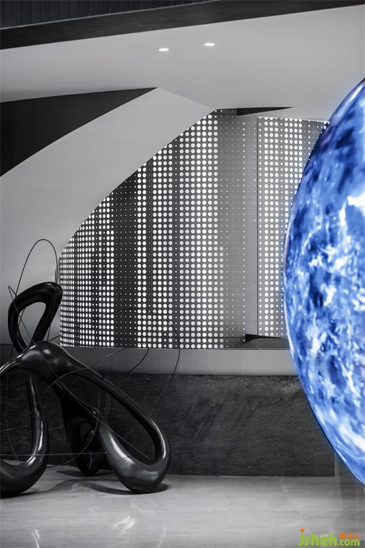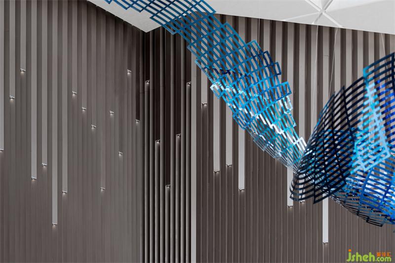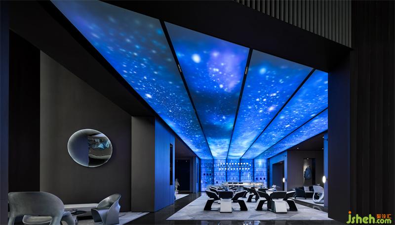 旅客們尚在回味,下一幕場(chǎng)景更為震撼:邁過(guò)巨型藍(lán)色行星,到達(dá)沙盤(pán)區(qū)?;⌒钨n予人類(lèi),直線歸于上帝。幾何狀鏤空天花分割自然光,照耀在觸手可及的“銀河系”精密金屬材質(zhì)裝置上。仰望星空,體會(huì)宇宙的玄妙,這藍(lán)色的詩(shī)像是生命的詠嘆調(diào),高昂的超脫,低徊的開(kāi)悟。