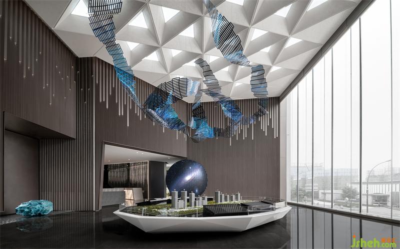 淙淙流水之上,隕石不再?zèng)]有溫度,這是專(zhuān)為旅客進(jìn)行太空穿梭收集的能量石。水石相生,激蕩出宇宙中最原始的能量和秩序。營(yíng)銷(xiāo)中心設(shè)計(jì)沙盤(pán)區(qū)一角的藝術(shù)裝置,在水景中放置“藍(lán)色隕石”,通過(guò)隕石的棱角與建筑及觀者對(duì)話。太空旅客在此涉取靈感和能量,構(gòu)筑一個(gè)微妙宇宙。