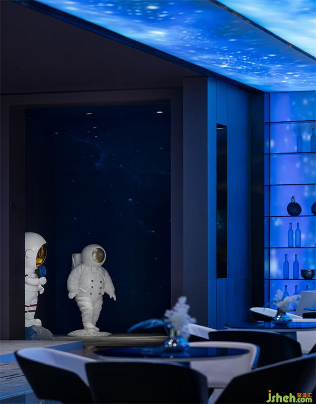 “撞入”墻體的隕石配合墻體光源,成為洽談區(qū)空間里的獨特風景。月球燈下身穿宇航服的領航員“走出”,向旅客宣讀太空漫游指南。將“意外”布置為藝術,零次方計劃的奇技淫巧、匠心妙想,在細微之處盡數(shù)體現(xiàn)。
