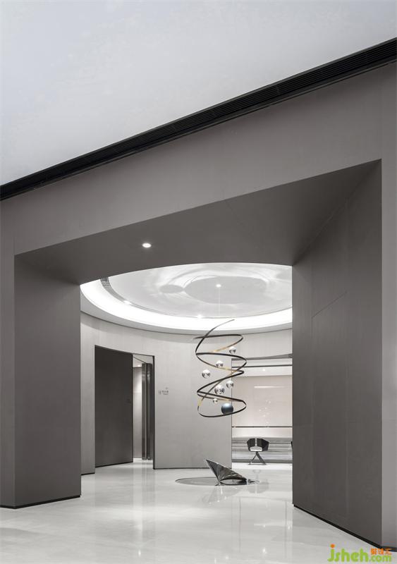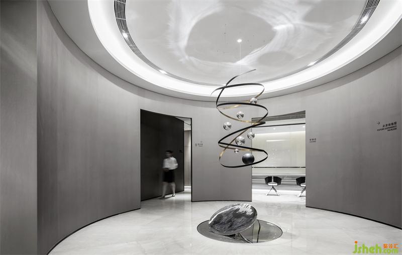 營銷中心設計墻體隕石裝置藝術來自雕刻家霍奇斯,他選用了搶眼的金屬色系和不銹鋼材質,巖石的設計參照了星際的夢幻,為冰冷的石塊注入一絲絲溫度,這樣的做法使得這些巨大的巖石無形中被點綴上了神圣的色彩。