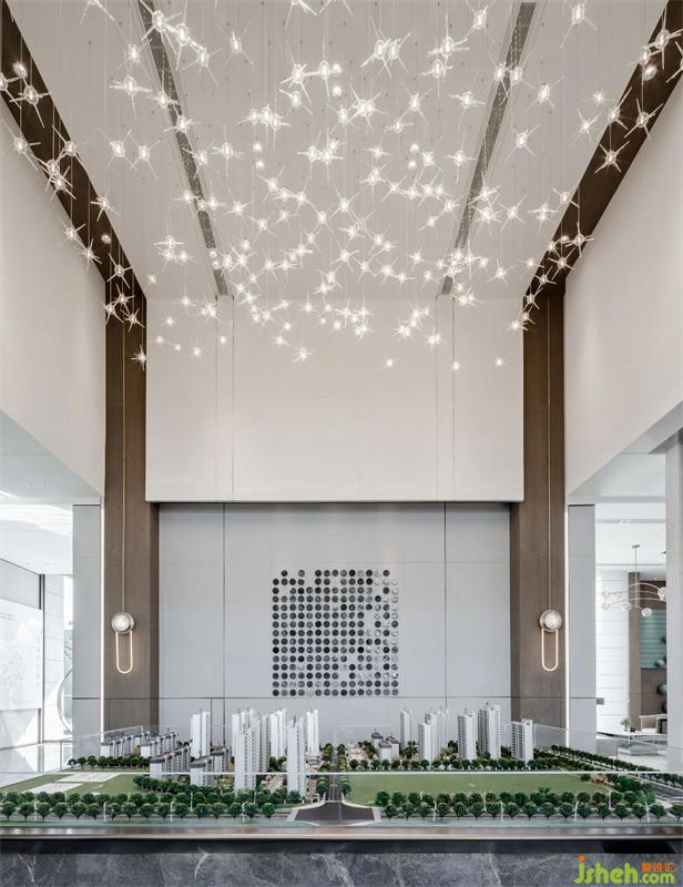 “影動一星辰 古今兩相宜”沙盤區(qū)天花藝術(shù)裝置,以“星”為元素,來展開星星點(diǎn)點(diǎn)匯聚成星河。