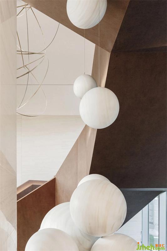 衛(wèi)生間盥洗區(qū)空間懸吊線條感的體塊,同時(shí)將洗手臺拆分重組形成錯(cuò)位拼接的體塊,墻面也是由一條金屬構(gòu)件藏光的手法加以藝術(shù)吊燈以硬朗的線條藝術(shù)切割空間,大面積暖色木飾面營造舒適自然的氛圍,使其在空間立體中變成那一處光芒。