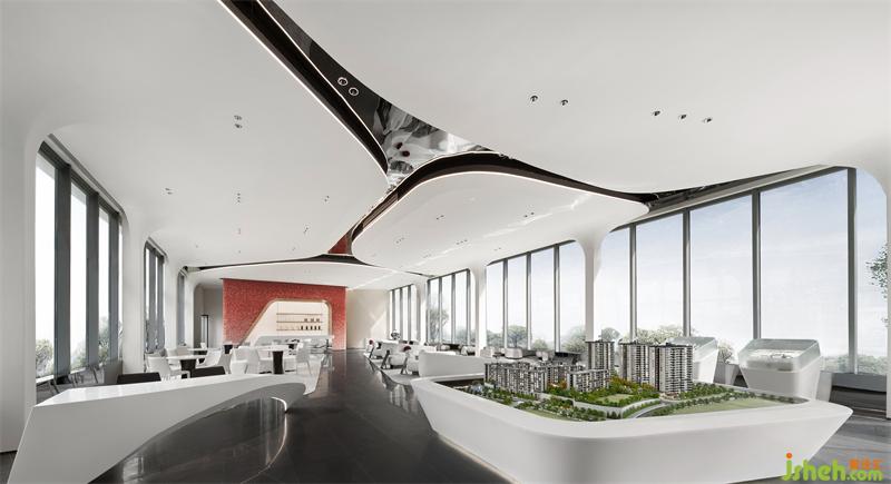 空間在尺度上并不具備優(yōu)勢的狹長空間中,營銷中心設計師在滿足售樓處功能的同時,通過縱向挑空,橫向拉伸的設計原則,為空間打造盡可能的開敞布局,使整體空間與建筑、戶外景觀融為一體,減少局促感、壓迫感。