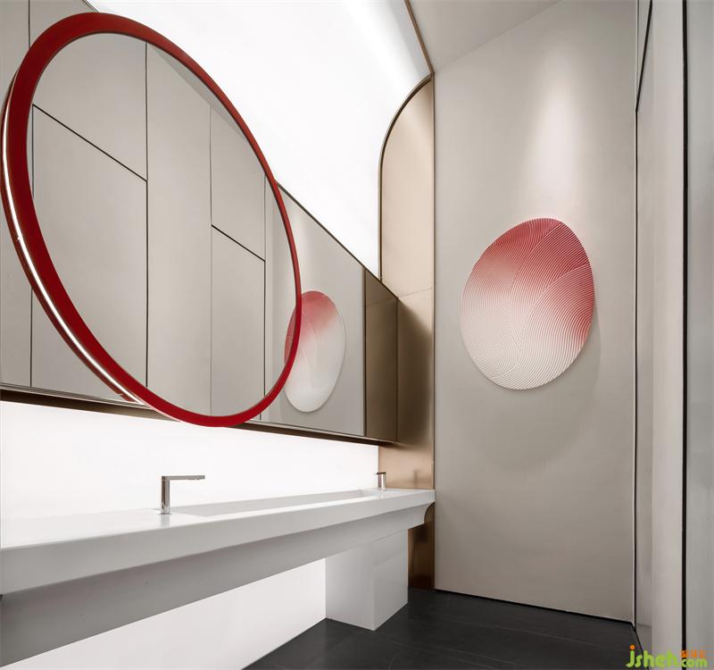 在請上用大面積的紅色基調(diào),在純凈利落的白色背景下加入紅色點綴內(nèi)部空間的雛形,細(xì)節(jié)處輔以不同的新材料,讓那抹代表著火熱的紅色營造視覺焦點??臻g天花幾條界定空間的弧線創(chuàng)造了視線與動線的延伸并讓日光灑于其上而形成時間的印跡。