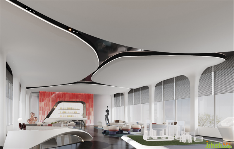洽談區(qū)的設(shè)計打破傳統(tǒng)做法,融入咖啡吧+書吧+潮玩集合地的設(shè)定,將潮玩與工藝器具集合展示,盡顯活潑與趣味性,臨窗而坐,這里可以飲茶、讀書,也可以交談、小憩。
