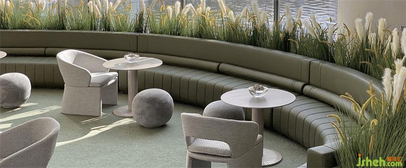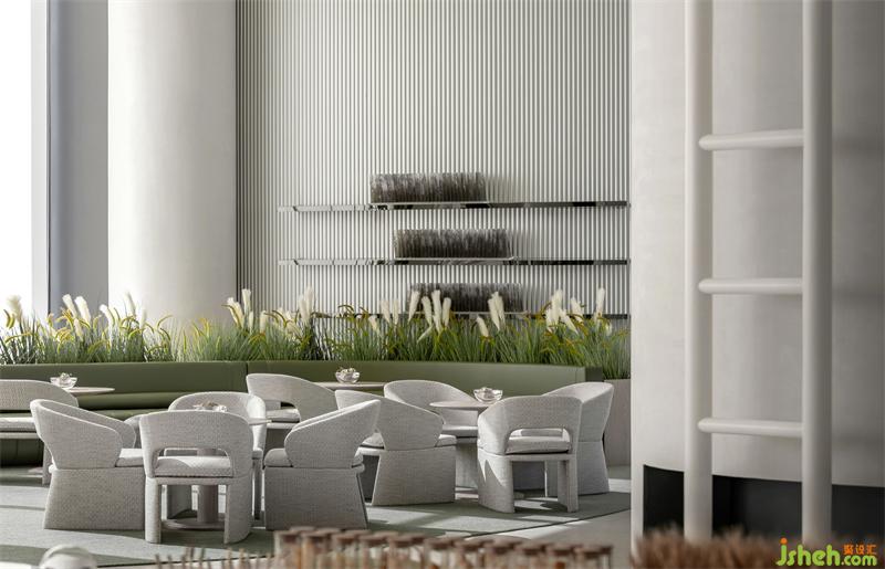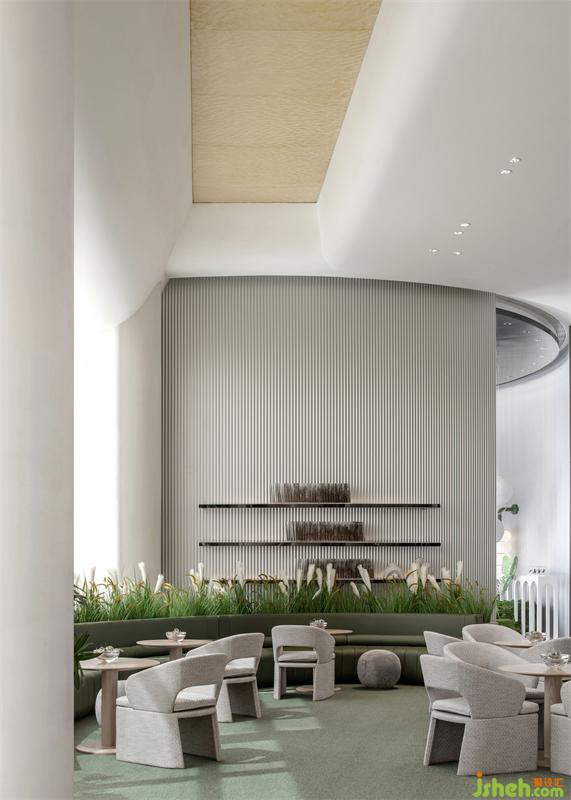 蘆葦蕭蕭吹晚風,畫船長在雨聲中。青一塊、白一塊,離不開,留下來。一條環(huán)形的“碧綠河流”繞著石子和蘑菇,滋養(yǎng)著背后的一大片蘆葦灘,也呼應著此處水紋亞克力裝飾的天花。抬頭是波光粼粼,低頭是青翠飄逸,露珠狀的燈飾、蘆葦和石子裝置在沉浸式的洽談區(qū),圍合出這處鬧中取靜的弧形體驗區(qū)。