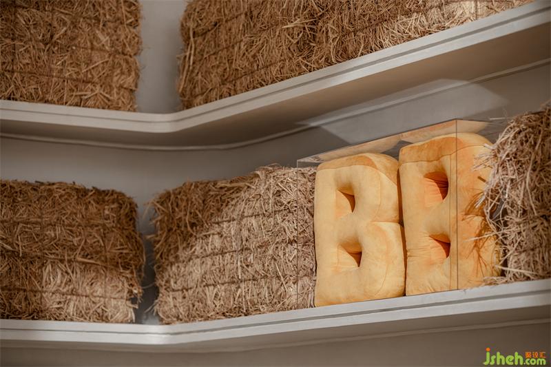 白色“原木桌”浮在漣漪狀暖色漸變地毯上,就像漂在池塘水面,生活體驗(yàn)館設(shè)計(jì)周圍的純白墻面懸空布置著稻草垛和字母面包,仿佛只要招手,這些大自然的香甜饋贈(zèng)就即刻到來。谷倉工坊還承擔(dān)著空間里的互動(dòng)功能,只要你愿意,就能在此進(jìn)行食物DIY。