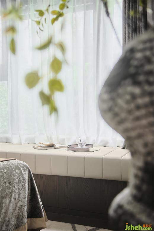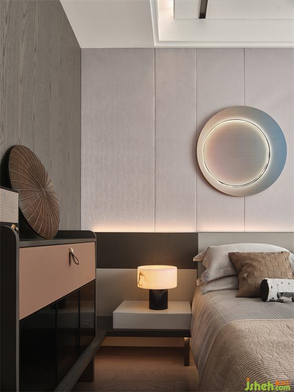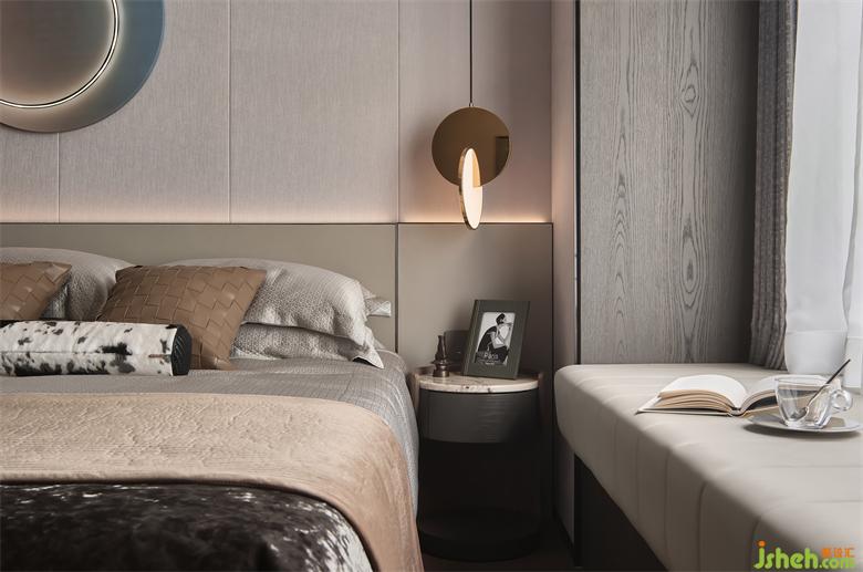 過道式的延伸使我們多了一份暇想,儲(chǔ)物格的面和臺(tái)面用同色紋路肌理相結(jié)合,延續(xù)了空間的搭配,使整個(gè)空間更加協(xié)調(diào)統(tǒng)一,南京樣板房設(shè)計(jì)打造出空間獨(dú)有的沉靜氛圍提升臥室的觀感。