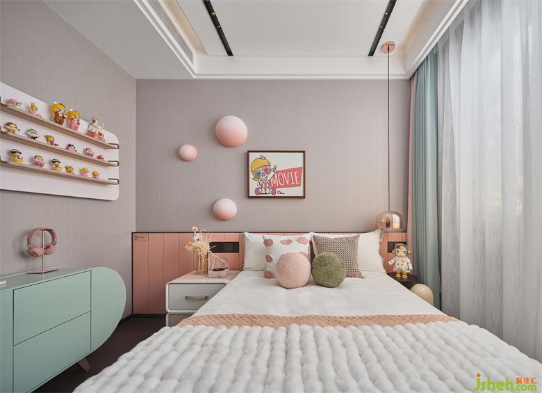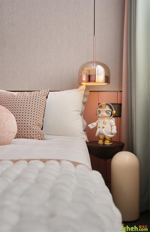 女孩的臥室采用淺粉色為主調(diào),墻壁的油漆肌理隱約展露出揮揮灑灑的設(shè)計(jì)手法。以此凸顯孩童純真的個(gè)性與美好向往。