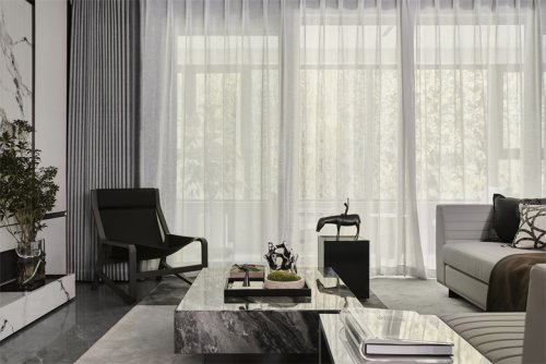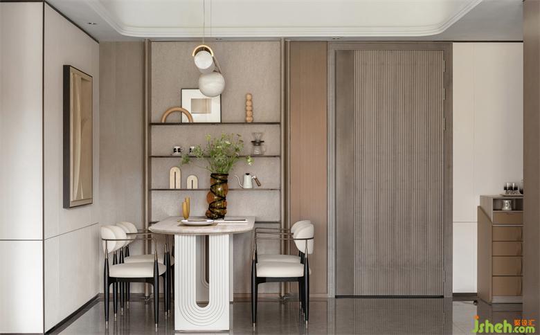 空間內(nèi)多次運用斯卡帕疊級元素拱門及幾何圖形貫穿空間,廈門湖畔潤璟樣板房設(shè)計以宜人的尺度,展示空間的幾何比例關(guān)系,描繪界限的同時巧妙地過渡不同的部分,極具裝飾性意義。