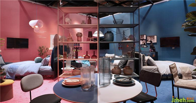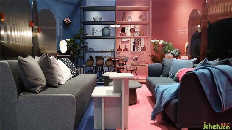 在共享空間實驗室里,設計希望通過強烈的色彩對比,并僅僅通過軟裝搭配,表達男女在同一個空間中生活的私密和融合。攜手和借助軟裝設計工具和線上采購平臺美間,探討利用軟裝陳設提升空間并挖掘新生代年輕人在“共享”思維下的生活新樂趣,為觀展者提供沉浸式的家居體驗,共同探討現代生活場景下的人人關系、人物關系、物物關系。設計首先從色彩的處理方式入手,試圖做出強調彼此之間的強烈對比關系來塑造空間的第一印象和沉浸體驗感,主要采用了偏深沉冷靜的星辰藍和明亮活潑的溫柔粉作為空間的主要色彩表現,配合豐富而高飽和度的燈光色彩變化,營造空間整體環(huán)境色。而其中的軟裝搭配則采用一定比例的主色調反差色,達到一種視覺沖擊的感官印象。