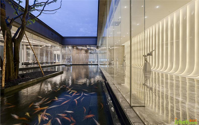 室內(nèi)為展示區(qū)和洽談區(qū),運用了具有幾何感立體格柵構(gòu)成了墻面進行空間的隔斷。洽談區(qū)旁是由連續(xù)的玻璃墻面環(huán)繞水池而成的中庭景觀,成為了室內(nèi)的一個景觀點。室內(nèi)設(shè)計師