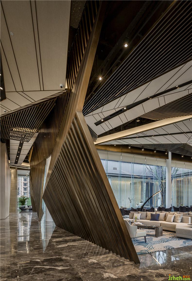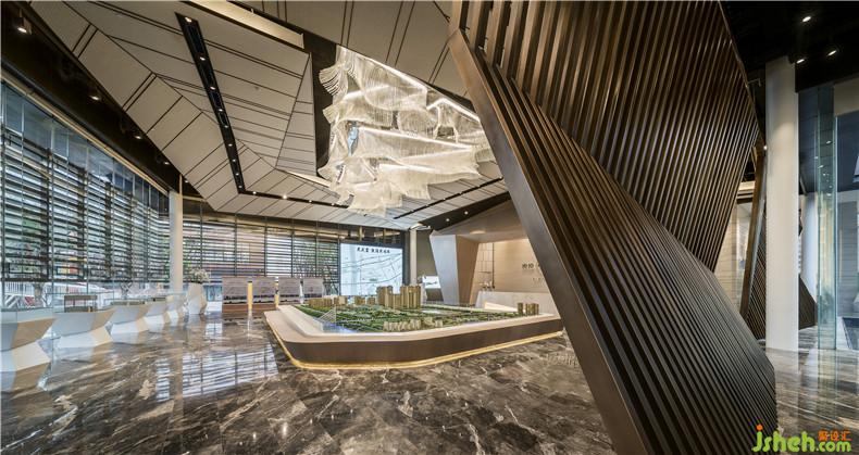 建筑前方置入了一個非常大的景觀水池,整個建筑如同漂浮在水面上。一個約50米走道切開水面連接了售樓處的入口,可以由此緩緩進入室內(nèi)空間。進入室內(nèi)前會通過一個由輕薄的石材墻面組成的16米高的入口,空間高聳遠觀側(cè)面如同折紙。從外部開闊的空間進入壓縮的入口通道后再進入開闊的室內(nèi),形成了有縮有放的空間的律動,整個過程充滿了儀式感。室內(nèi)設(shè)計師