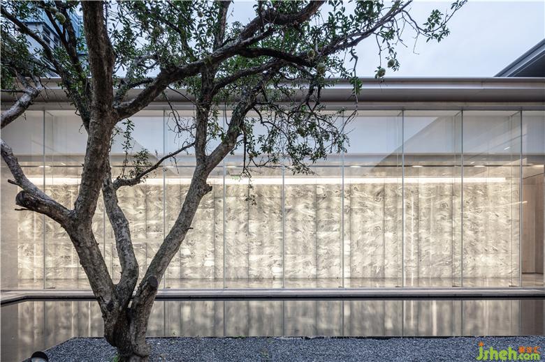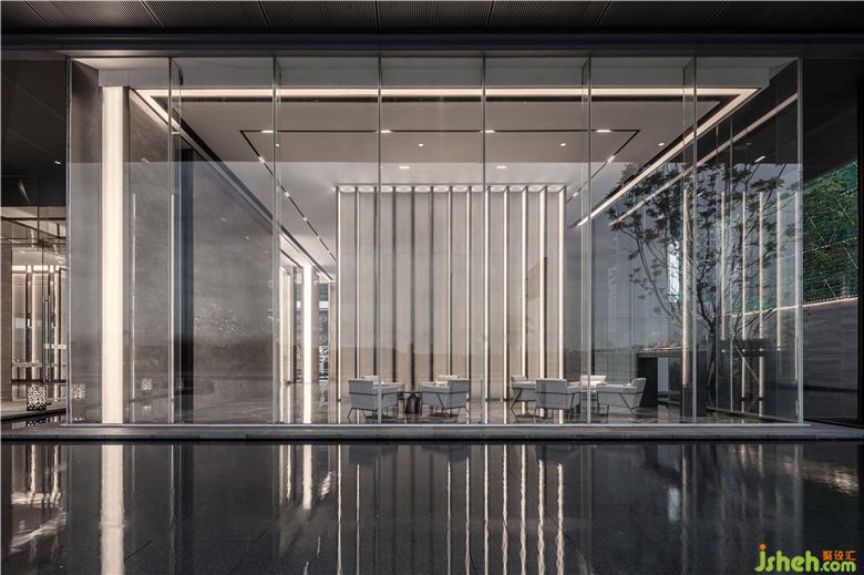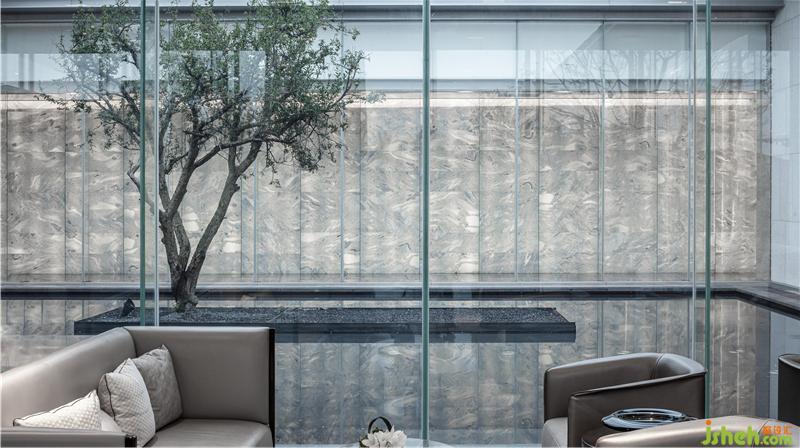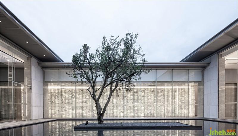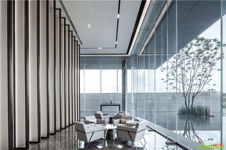 引一池水,置一株樹。洽談區(qū)臨水而設,落地玻璃形成通透的視覺景觀,鏡面澄澈,樹影婆娑,一池一景;環(huán)境的細節(jié)營造令人沉浸其中,欣賞體會。