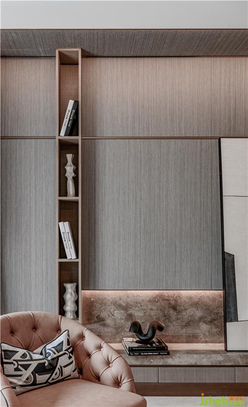 整個空間擯棄紛繁復雜的裝飾造型,以大面積的米色勾勒出空間墻面的底色,樣板房設計配以素雅的米色石材地面,再輔以深棕色作點綴,在柔和的自然光線下營造出靜謐閑適的氣質。