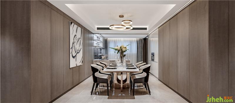 起居室、餐廳、廚房一體化設計,弱化功能區(qū)域的界限,增強室內空間的通透感,提升空間的尺度感。一體化的設計強調空間的連續(xù)性,空間相通,形成一個較大的視覺縱深,空間層次更豐富,具有更強的流動性。
