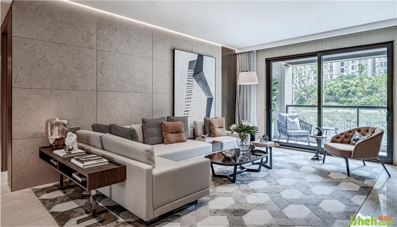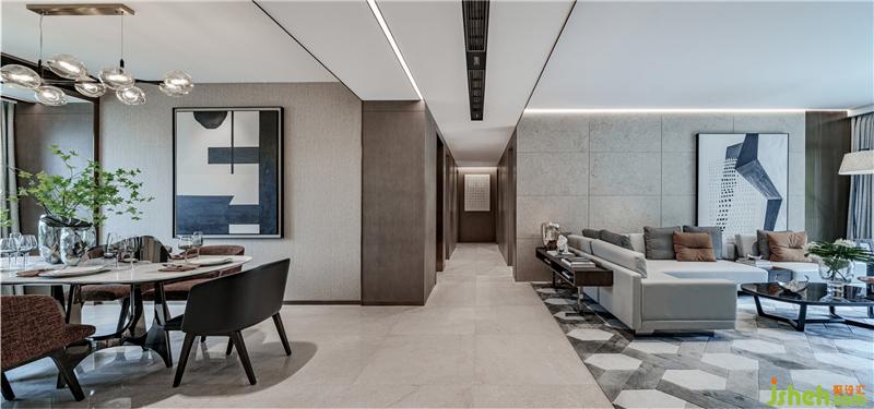 公共空間開敞式的設計帶來開闊的空間感受,入戶后從玄關至起居室、餐廳,層層遞進,光線和自然之景的引入,讓空間中的每一處都是輕松愜意的。溫暖柔軟的材質(zhì)布滿人體所能接觸的地方,同石材背景墻形成軟和硬、光滑與粗糙、溫暖與清冽的對比。
