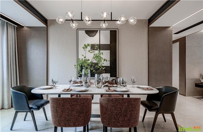 餐廳延續(xù)客廳的調(diào)性,米白暖棕調(diào)所呈現(xiàn)出的溫暖與寧靜,與整個空間和諧呼應。樣板房設計餐廳與廚房棕色夾絲玻璃的運用,通透又獨立,面向花園的景觀餐廳不錯過每個季節(jié)的精彩。
