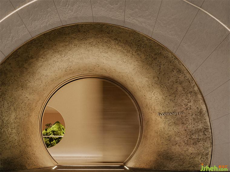 美學(xué)中心設(shè)計不同于其他大開大合的商業(yè)空間,這是一個幾乎密不透風(fēng)的空間外立面,大面積米白色肌理石貼面覆蓋著整面墻,以金色的金屬洞口為原點的墻面上的圓弧線,在增加外立面層次豐富度的同時,以一種更加柔和的方式指引著人們進(jìn)入空間探尋。