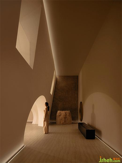 步入空間內(nèi)部,難以看見棱角分明的空間體塊,富有精美視覺體驗的曲線感充斥著人們的視野,圓潤的洞口如氣泡一般,有機地銜接著不同的空間。