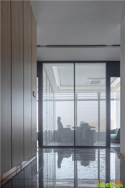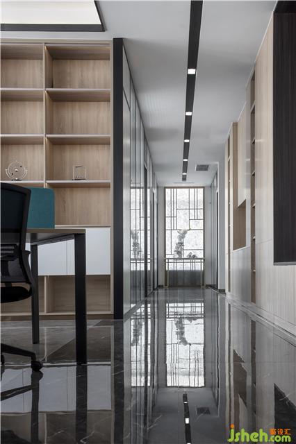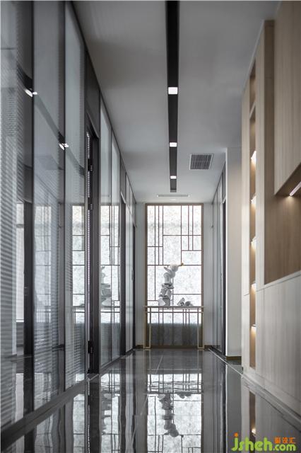 可容納多人的會議室,天花的造型與會議桌相呼應(yīng),大面積的落地玻璃讓整個空間更加明亮。