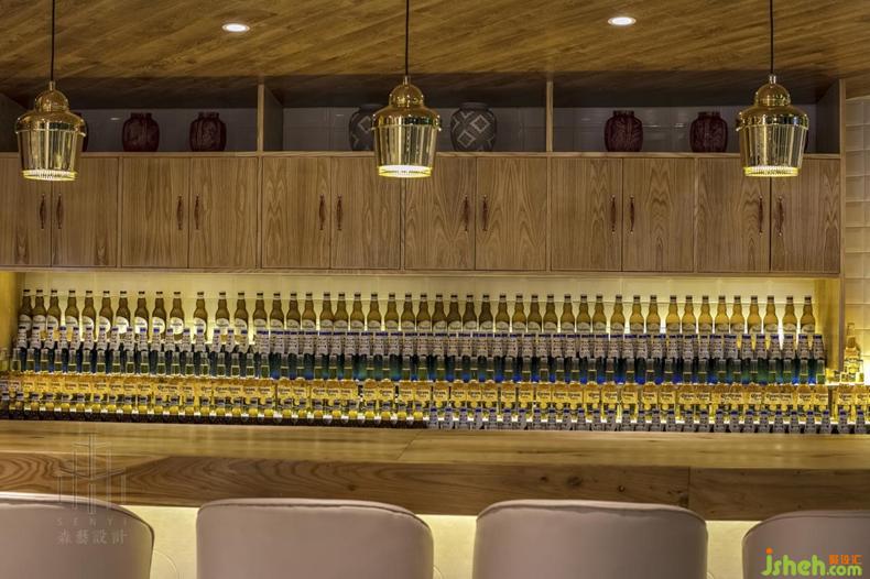 吧臺的設(shè)計是歲月沉淀下來的復(fù)古,金屬古銅吊燈與天然紋理制成的木式吧臺成了最佳搭檔,錯落有致的酒品陳設(shè)融入空間,帶著酒香也釋放著豪放的氣息。