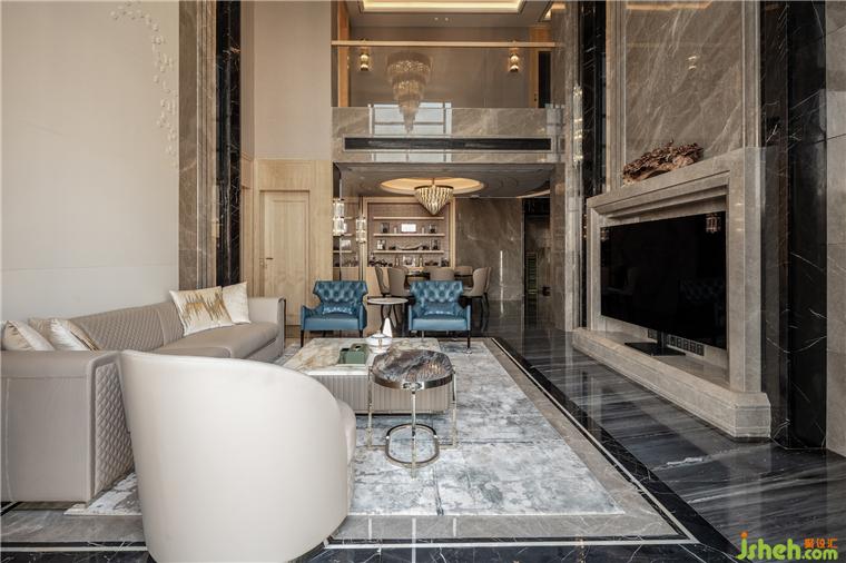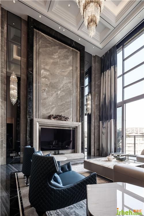 從玄關(guān)進(jìn)入挑高開闊的客廳,灰色大理石與水晶吊燈碰撞出的藝術(shù)張力,兼具秩序感與靈動(dòng)性,點(diǎn)綴天海般純凈的藍(lán)色,演繹出浩瀚蒼穹,這源于人們對(duì)于山巒、流水、叢林、天空天然的向往,它們一方面象征著自然力量,可以不斷滋養(yǎng)內(nèi)在精神,一方面溫潤柔軟,總能帶給生活許多靈感和滋養(yǎng)。
