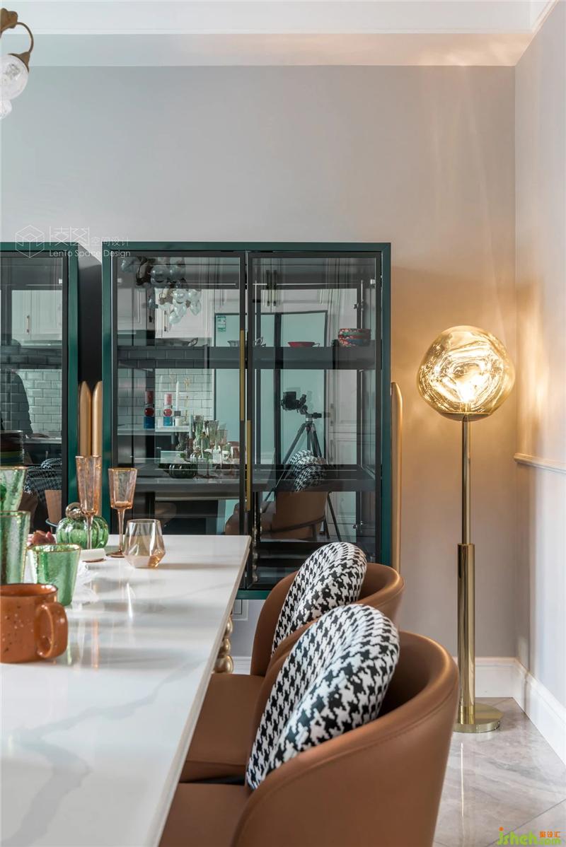 墨綠色的酒柜與客廳沙發(fā)的色彩,
