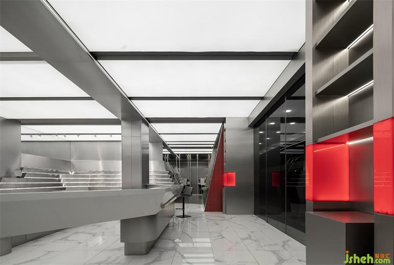 整個(gè)流線型的科技山丘,對(duì)原有的建筑邊界進(jìn)行了解構(gòu)重組。展廳設(shè)計(jì)創(chuàng)造出內(nèi)外之間多變的空間交互關(guān)系。從最左側(cè)的山丘式陳列臺(tái),到極富戲劇感的紅色驗(yàn)光區(qū)傳達(dá)一種安全感的庇護(hù),驗(yàn)光這是一個(gè)嚴(yán)肅的過程。展廳設(shè)計(jì)讓過路的流量從外部就可以感受到品牌與產(chǎn)品力??偱_(tái)時(shí)刻保持最佳狀態(tài),等待為客人提供增值服務(wù)。最右端的紅色發(fā)光體塊,定制的LED曲面軟屏利用動(dòng)態(tài)的數(shù)字內(nèi)容快速提升空間氛圍和商業(yè)趣味。