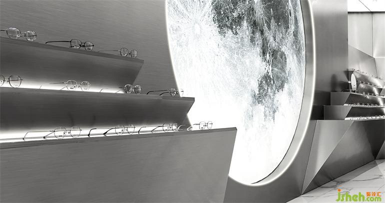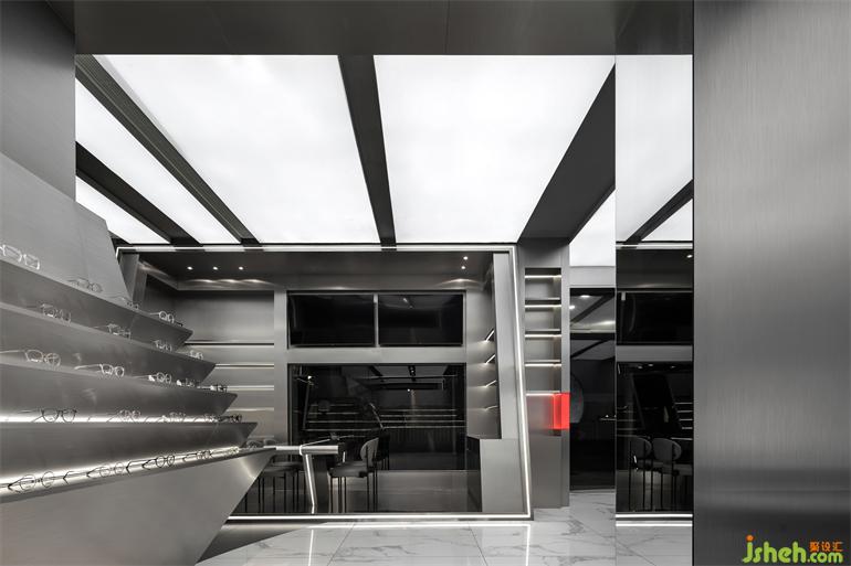 金屬質(zhì)地需要光線烘托,在建筑框架內(nèi)尋變化。林彥先生的設(shè)計(jì)語言簡(jiǎn)潔利落,展廳設(shè)計(jì)通過這種調(diào)性營(yíng)造出品牌的專業(yè)屬性。“整個(gè)配鏡過程希望如精密實(shí)驗(yàn)般考究精準(zhǔn)”扶生如是說。
