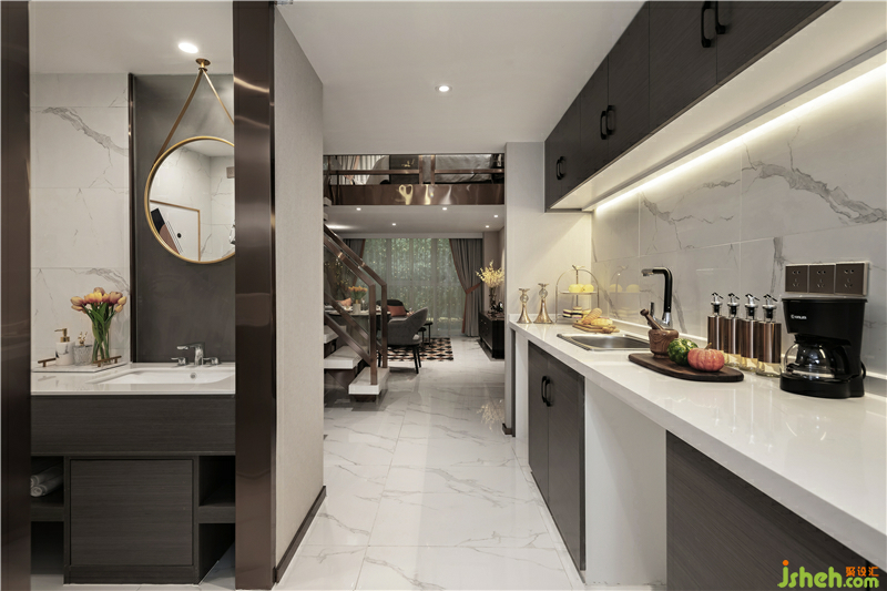 在淺灰咖的主體之下,暖色的光在晶瑩剔透的玻璃與金屬銅碰撞之間透過(guò)空氣彌漫開(kāi)來(lái),而石材肌理的顯性表現(xiàn),以及時(shí)尚趣味的藝術(shù)紋理亞克力巧妙融合在一起,將這空間的內(nèi)在韻味猶如畫(huà)卷平鋪開(kāi)來(lái)。