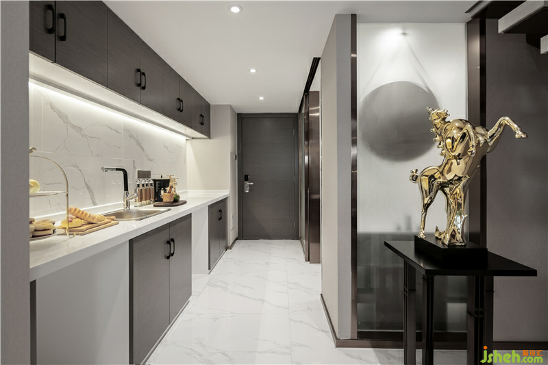 冷調(diào)暖光的籠罩,金屬質(zhì)感的細(xì)膩,絨質(zhì)材料的舒適,面料紋樣會(huì)呼吸的藝術(shù)肌理,在灰色的層次關(guān)系中無(wú)一不透著居家者的優(yōu)雅品味。軟裝在淺色面料的映襯下彰顯著空間獨(dú)特的詩(shī)意與雅致,而胡桃木原木家具的使用讓空間更具自然性與藝術(shù)性—屋不止是屋,也可以是品味與自然的結(jié)合。