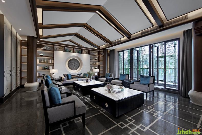 圓形玉石宛芳一輪明月,精選晶石及用料,圖案和肌理彰顯出巨大的張力,有種紛紛世態(tài)長松影,荏苒時光流水聲?;腥裟荞雎牪贿h處傳來的悠然綿長的鐘聲,那理不清道不明的凡塵舊事紛紛塵埃落定。博古架上青花瓷、古玩、木雕穿越時代之潮,循古人履易,玩古出新。
