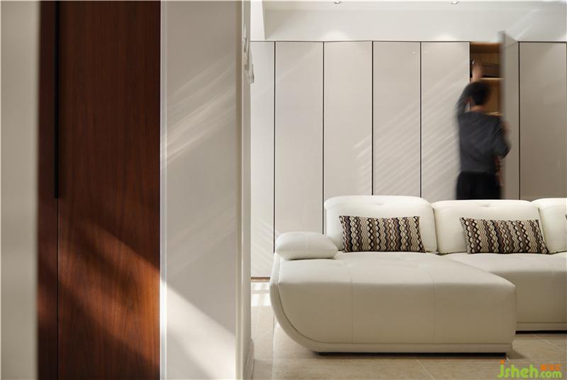 利用客廳西面墻凸出的承重柱做一組嵌入式裝飾柜,提供儲物功能;