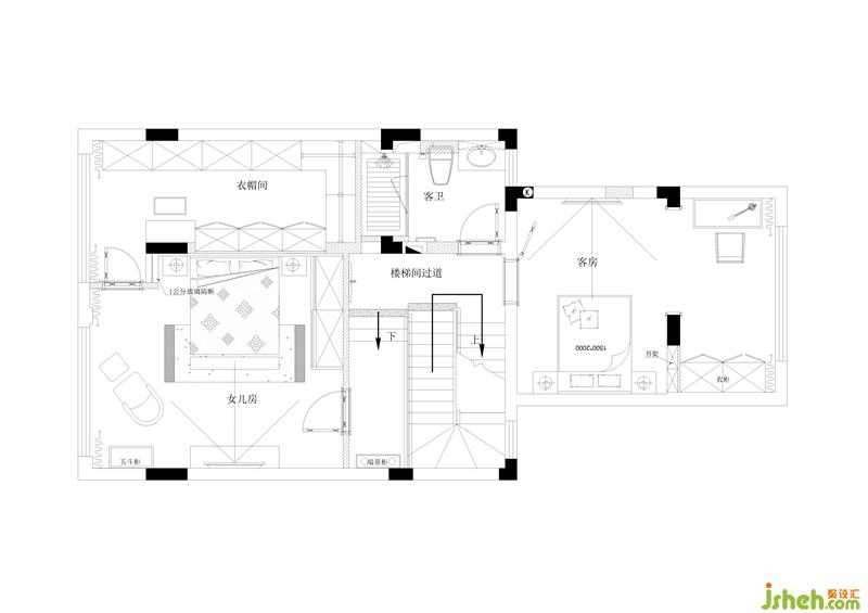 二層樓梯南邊的空間是下沉的,如果保留原有的下沉樓梯勢必會將一個大空間“攔腰斬斷”,為避免這個局面,設計師將原有的下沉樓梯封掉,改在東邊,介于南面空間和樓梯之間,這樣就保持了南邊空間的整體性;利用陽臺和承重墻把空間隔成成女兒房和衣帽間,形成套間;