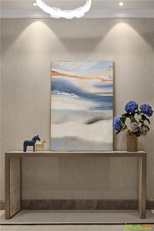 出了電梯門,正前方端景臺上抽象的山水畫以明麗的天空,別墅裝飾動態(tài)的水景打破封閉電梯間的沉悶感,給人予豐富的想象;