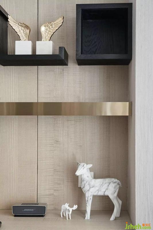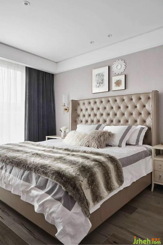 床背景室內(nèi)設(shè)計師采用了人字形地板,配上低調(diào)又不失質(zhì)感的壁燈,線條簡潔的家具襯托下,突顯優(yōu)雅的時尚韻味。