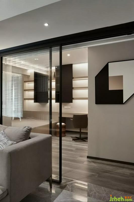 書房于客廳僅一扇移門為界,室內(nèi)設(shè)計(jì)師用通透的玻璃讓兩個空間保持獨(dú)立的同時增加了許多互動感,釋放了空間的可能性。