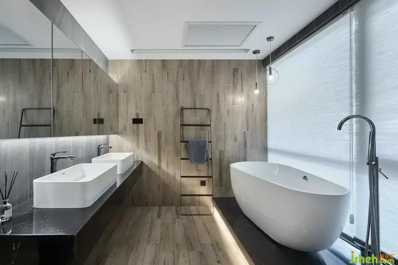 衛(wèi)生間室內(nèi)設(shè)計師選用獨立浴缸,發(fā)光的地臺劃分干濕區(qū)。木紋磚使本作品的“氣質(zhì)”一貫而終。