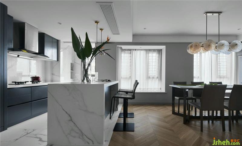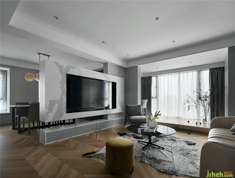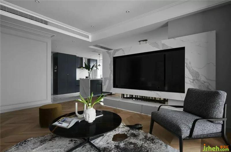 客廳、餐廳、廚房三者的開放式布局,流暢靈活,懸空的電視墻巧妙的劃分空間,提升社交娛樂功能的靈巧性,增加家人之間交流互動(dòng)的美好生活氛圍。