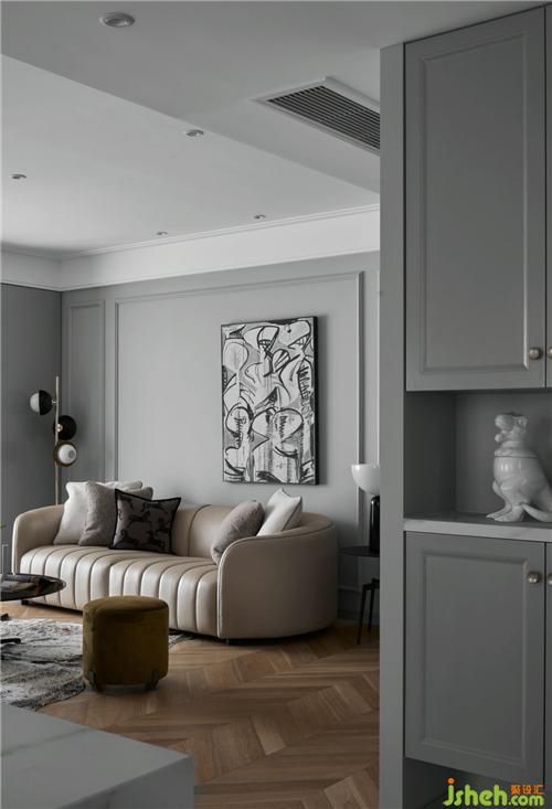 淺灰色的墻面搭配原木的地板裝修公司,溫暖而雅致,黑白抽象掛畫凸顯了空間的現(xiàn)代時(shí)尚觸感。