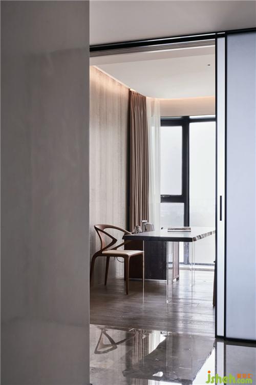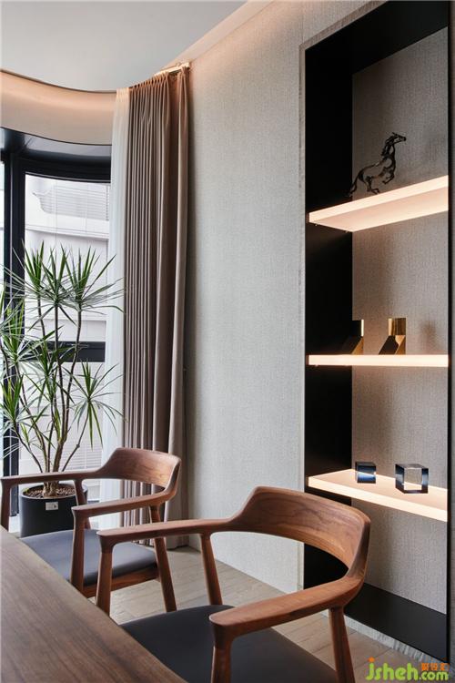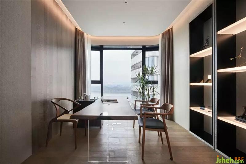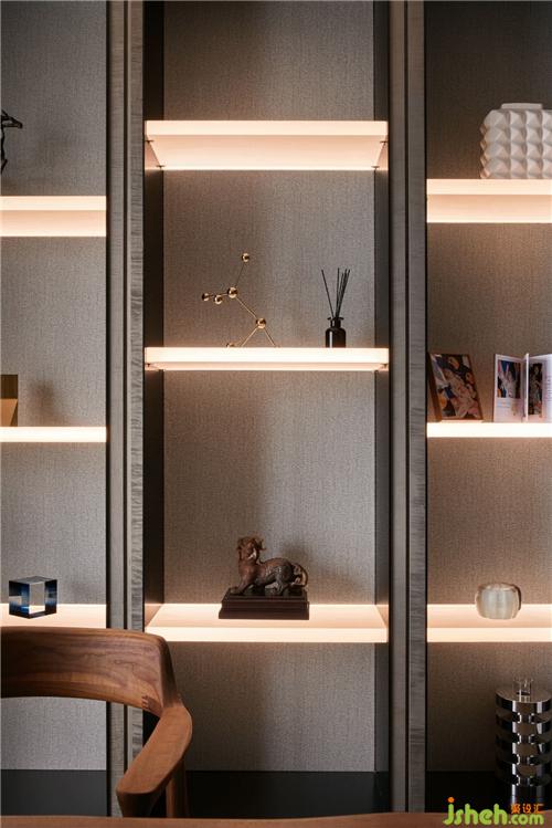書房延續(xù)客餐廳凝練的風(fēng)格,裝修公司稍加入簡(jiǎn)中式的元素,簡(jiǎn)潔大方,色調(diào)溫雅,亞克力透光板的展架增添空間靈動(dòng)氣息。