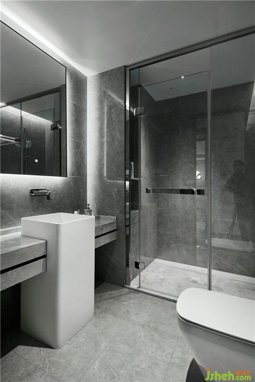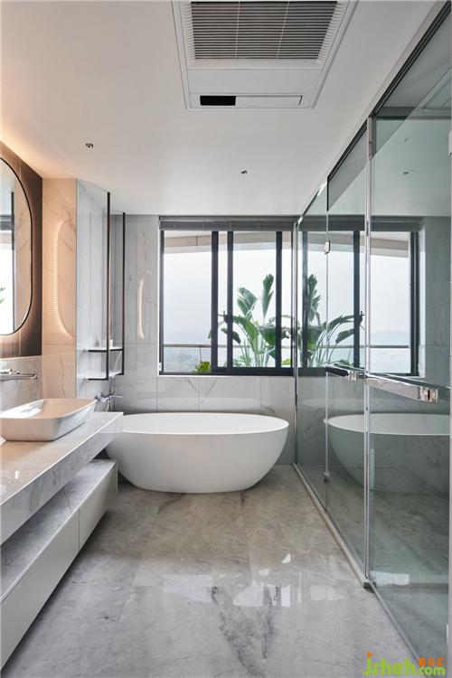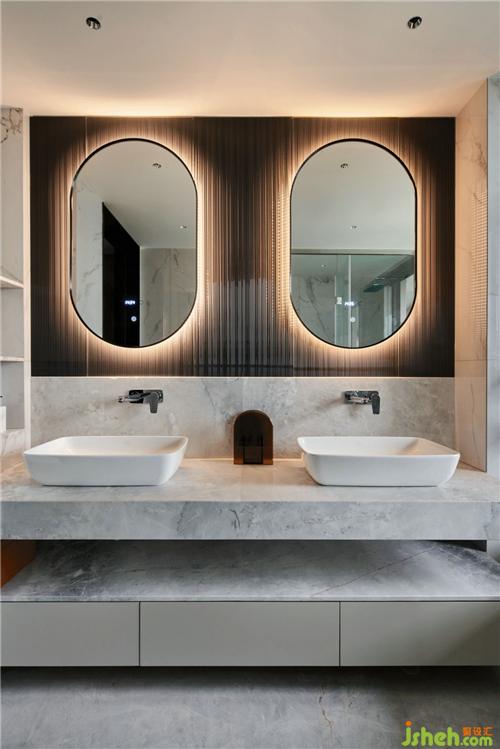 主衛(wèi)大面積淺色石材的運(yùn)用,清爽明亮,黑色波紋鏡面壓低了空間的調(diào)性,裝修公司讓空間的層次輕重分明。