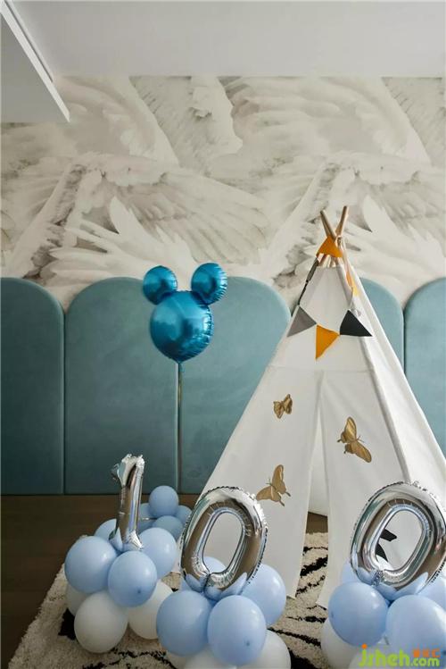 兒童區(qū)域淺藍(lán)色讓人如臨海洋,羽毛的壁紙活潑充滿張力,而小小的帳篷給予溫馨、夢(mèng)幻的氛圍感。