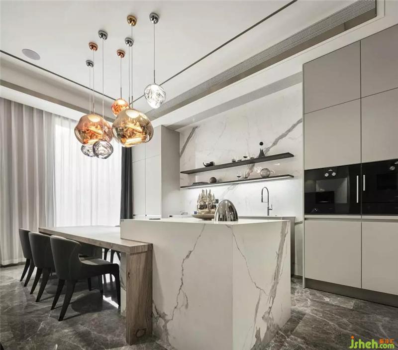 這套面積接近六百方的別墅,業(yè)主在跟設(shè)計師溝通的時候,提出一個需求要增加空間的互動感,所以別墅裝飾設(shè)計師打破了原有的餐廳結(jié)構(gòu),設(shè)計了一個社交廚房,增強客餐廳的交互性。