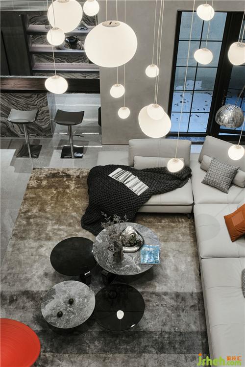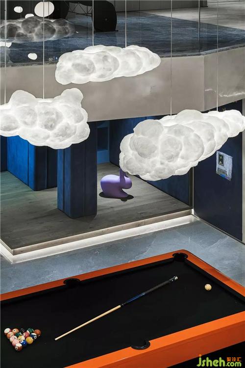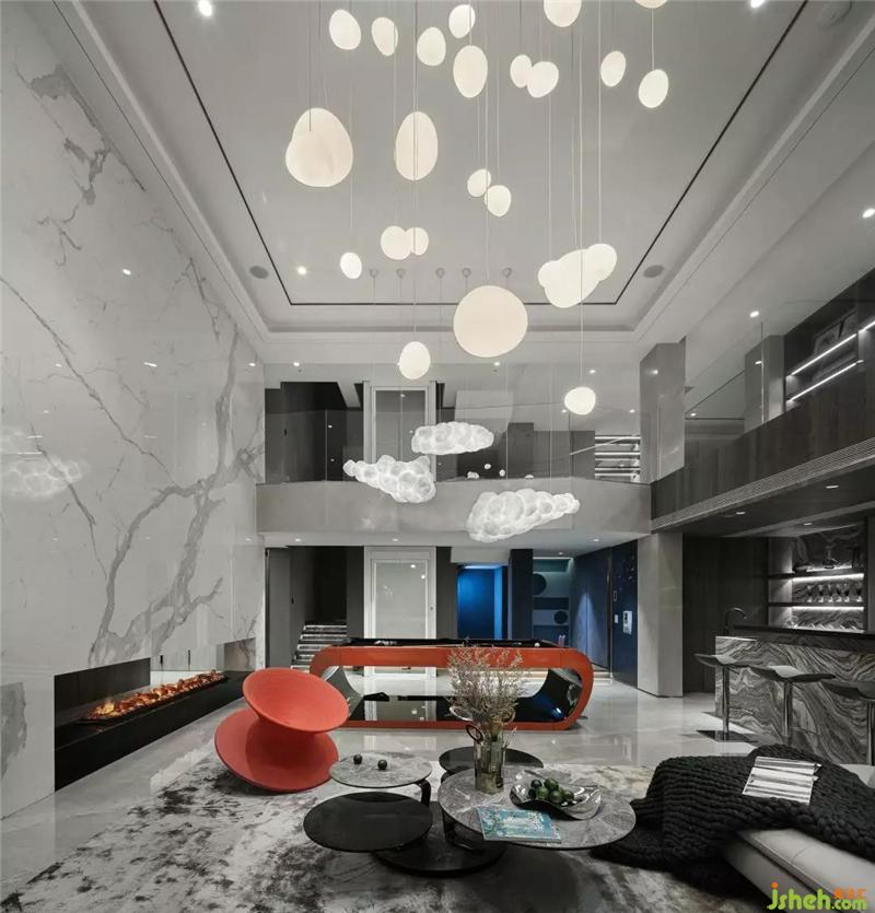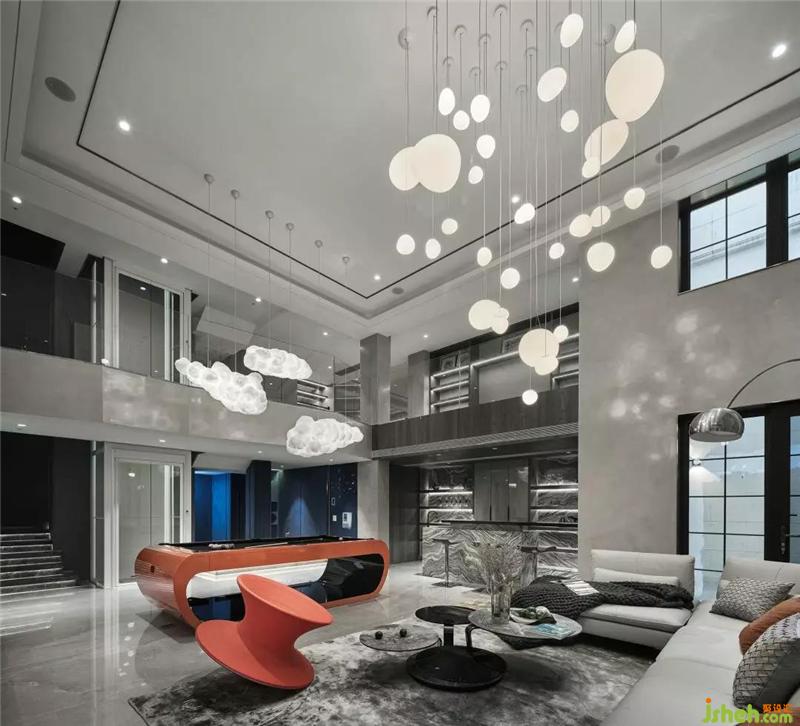 負(fù)一層挑高的空間讓地下室通透感十足,不同以往地下室低矮的壓抑感,愛(ài)馬仕橙的臺(tái)球桌和陀螺椅子,羅奇堡的旋轉(zhuǎn)茶幾,別墅裝飾搭配空中星星點(diǎn)點(diǎn)的不規(guī)則月球燈和云朵燈,整個(gè)空間充滿了奇幻趣味感。